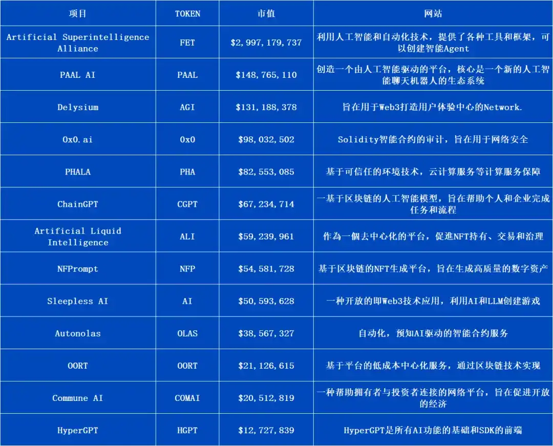根据前文分析,即便是获得顶级融资并拥有良好用户流量的 AI Agent 应用,也面临着商业变现的难题。接下来我们将深入分析当前 AI Agent 项目在 Web3 内的发展情况。通过对一系列代表性项目的评估—包括它们的技术创新、市场表现、用户反馈以及发展潜力,旨在挖掘出具有启发性的建议。下图为目前市场上已发代币且市值较高的几个代表性项目:
