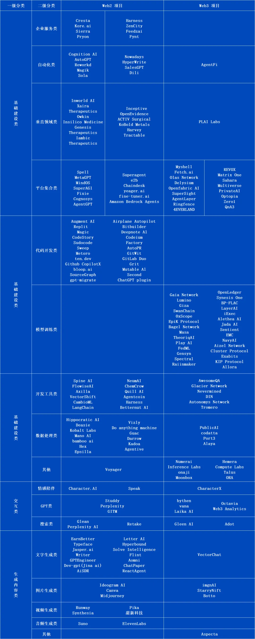 当下AI Agent市场尚未形成统一的分类标准,我们通过分别对Web2+Web3市场中204个AI Agent项目打标签的方式,根据每个项目对应的显著标签,分为了一级分类和二级分类。其中,一级分类为基础建设,内容生成,用户交互三种类别,再根据其实际用例进行细分: