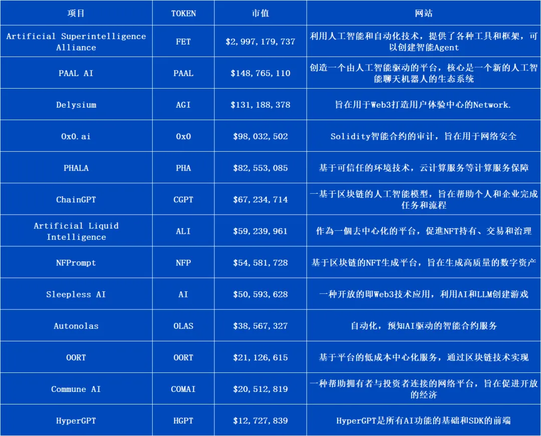 根据前文分析,即便是获得顶级融资并拥有良好用户流量的AI Agent应用,也面临着商业变现的难题。接下来我们将深入分析当前AI Agent项目在Web3内的发展情况。通过对一系列代表性项目的评估—包括它们的技术创新、市场表现、用户反馈以及发展潜力,旨在挖掘出具有启发性的建议。下图为目前市场上已发代币且市值较高的几个代表性项目: