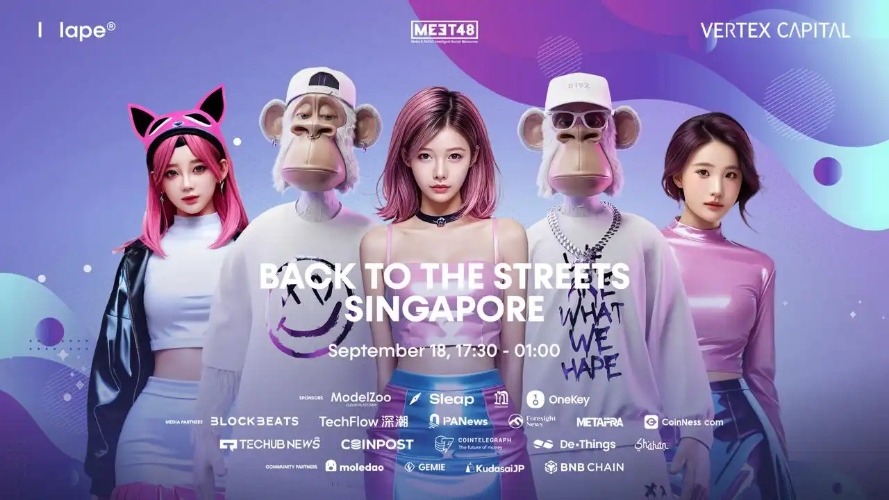 此前,TOKEN2049 已经正式宣布 MEET48 将作为白金赞助商加入新加坡 TOKEN2049。同时,MEET48 也将于 9 月 18 日晚上与 Hape 共同举办「回到街头 Back To The Streets」大型 AI+Web3 应用 Side Event,并由 ModelZoo、TraditioNow、OneKey、BNB Chain 等合作方大力支持。