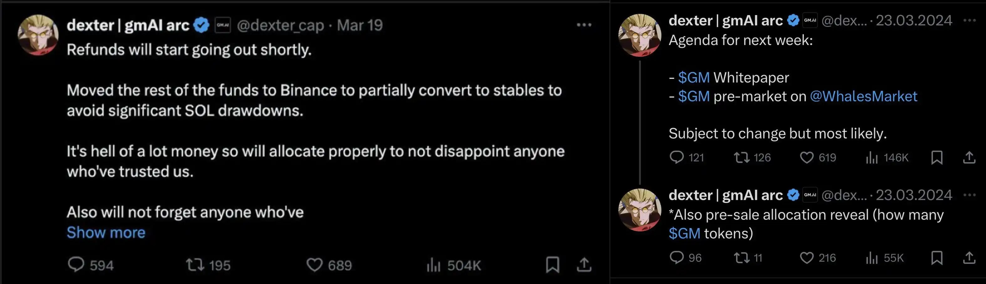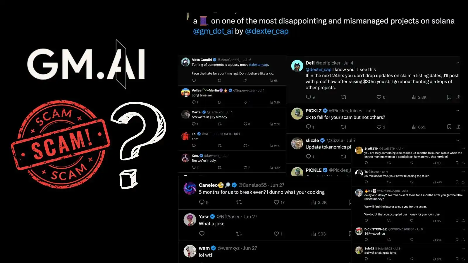 编者语:今年 3 月 18 日,Whales Market 创始人 dexter 宣布开启其在 Solana 上的 AI 项目代币预售,仅半小时内就筹集了 155,364 枚 SOL(约 3200 万美元),超过 3000 万美元预售硬顶。但 dexter 却在预售完成次日,将预售资金存入了 Binance。数月过去,终于在 8 月 14 日,gm.ai 官方宣布GM 代币上线。然而,间隔如此之久,预售参与者们等来的却是上线立亏百分百。参与者们被割得体无完肤,称得上是币圈年度大骗局。加密 KOL 0xkevin 在 X 上对这场骗局的始作俑者进行了曝光, 转载全文如下: