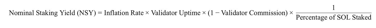 质押收益受到通货膨胀率、验证者的在线时间、验证者收取的佣金率和被质押的 SOL 百分比的影响。公式为: