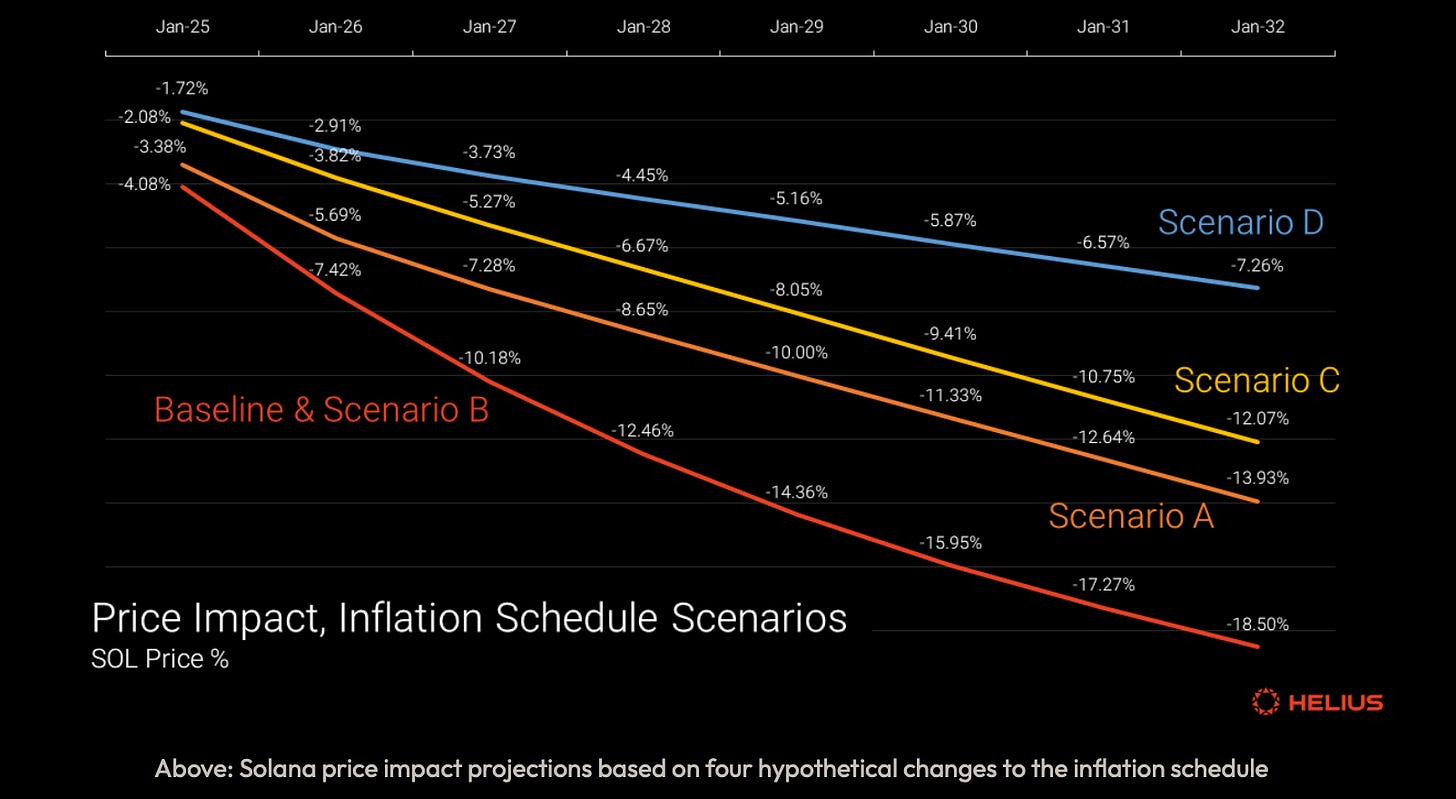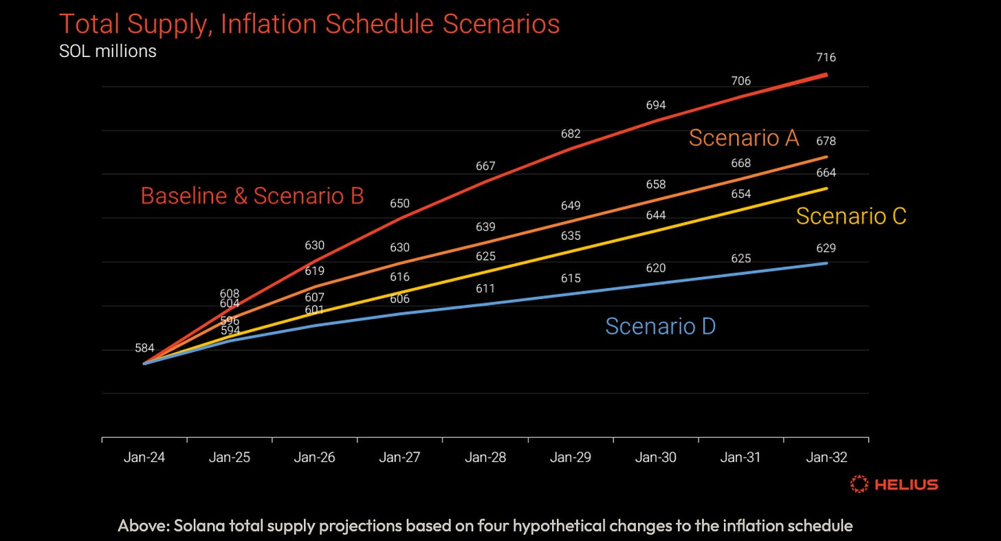 Solana 的通货膨胀目前由 8% 的初始通货膨胀率、-15% 的去通货膨胀率和 1.5% 的长期通货膨胀率设定。截至 2024 年 9 月,目前的通货膨胀率约为 5%,目前的总供应量为 5.84 亿 SOL。提出了四种情景来探索可能的变化: