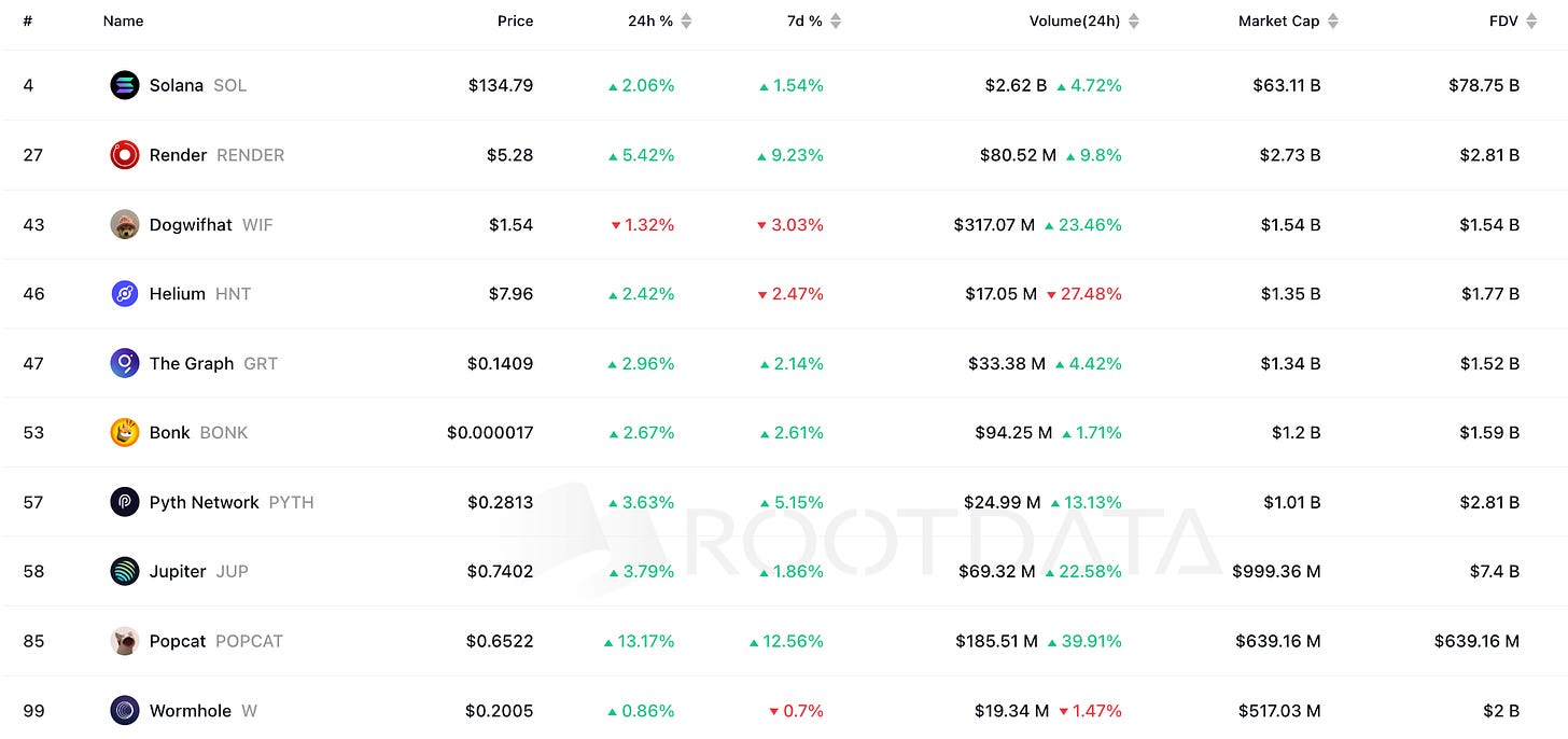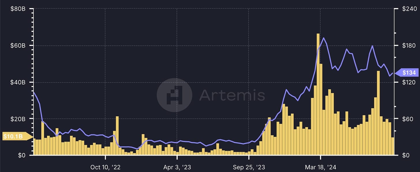 Solana 的市场资本约为 630 亿美元,是领先的区块链平台之一。它已成为引导链外用户的首选,特别是在去中心化物理基础设施网络 (DePIN)、移动应用和支付等领域。在之前的新闻通讯中,我们强调了基于 Solana 构建的 DePIN,包括 Helium 和 Hivemapper。