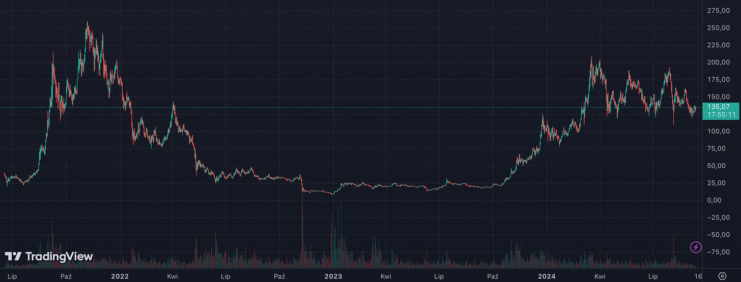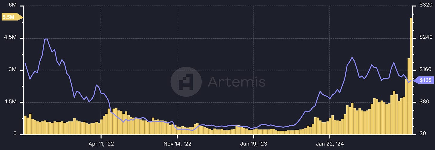 紫线 - SOL 价格;黄线 - SOL 日交易量