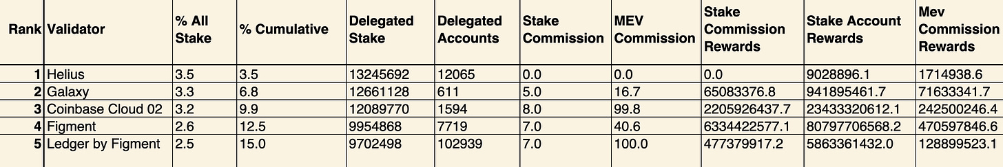 前 5 个 Solana 验证者(注意:所有数值以 SOL 计;数据包括所有质押的代币,而不仅仅是活跃质押的代币)