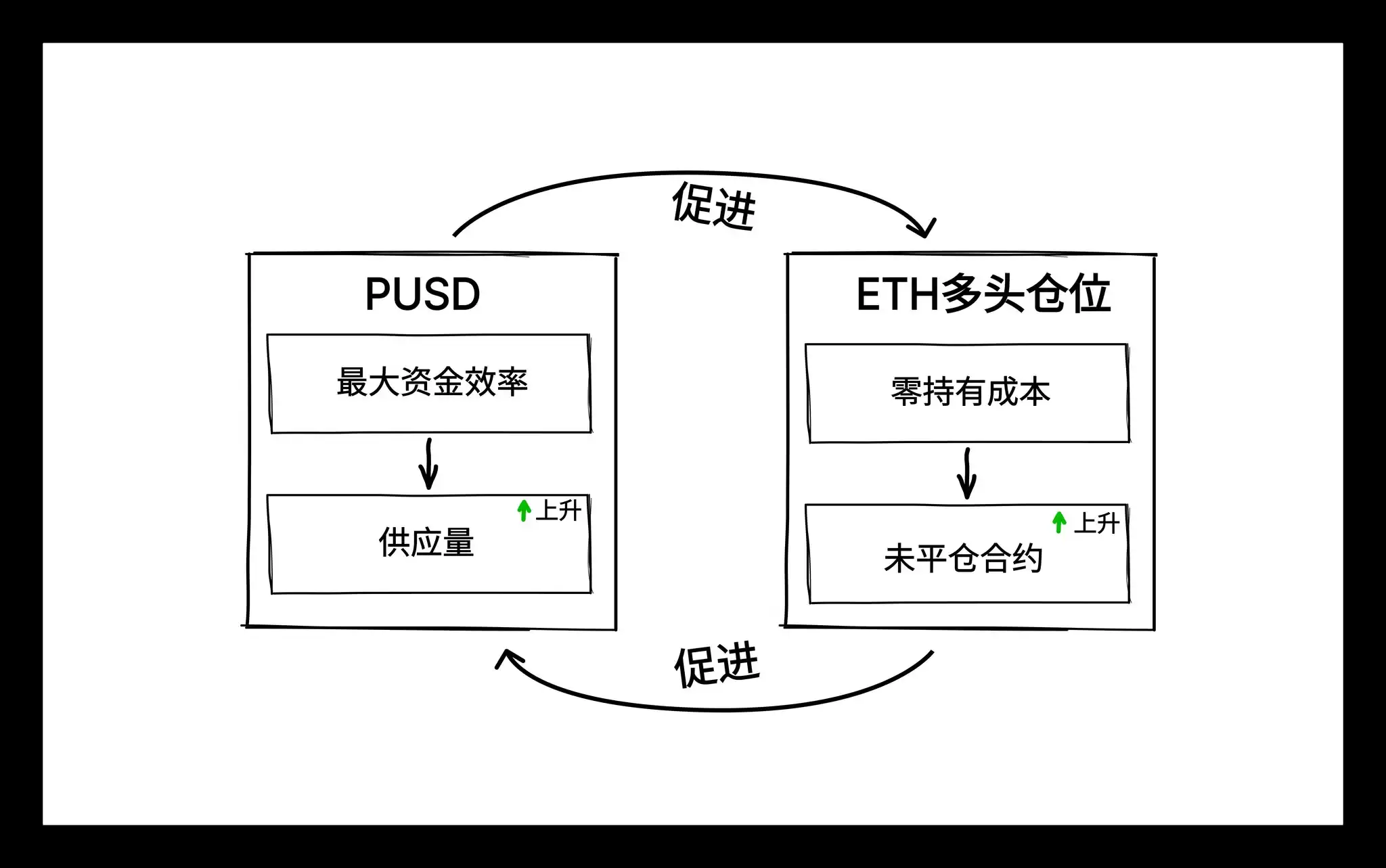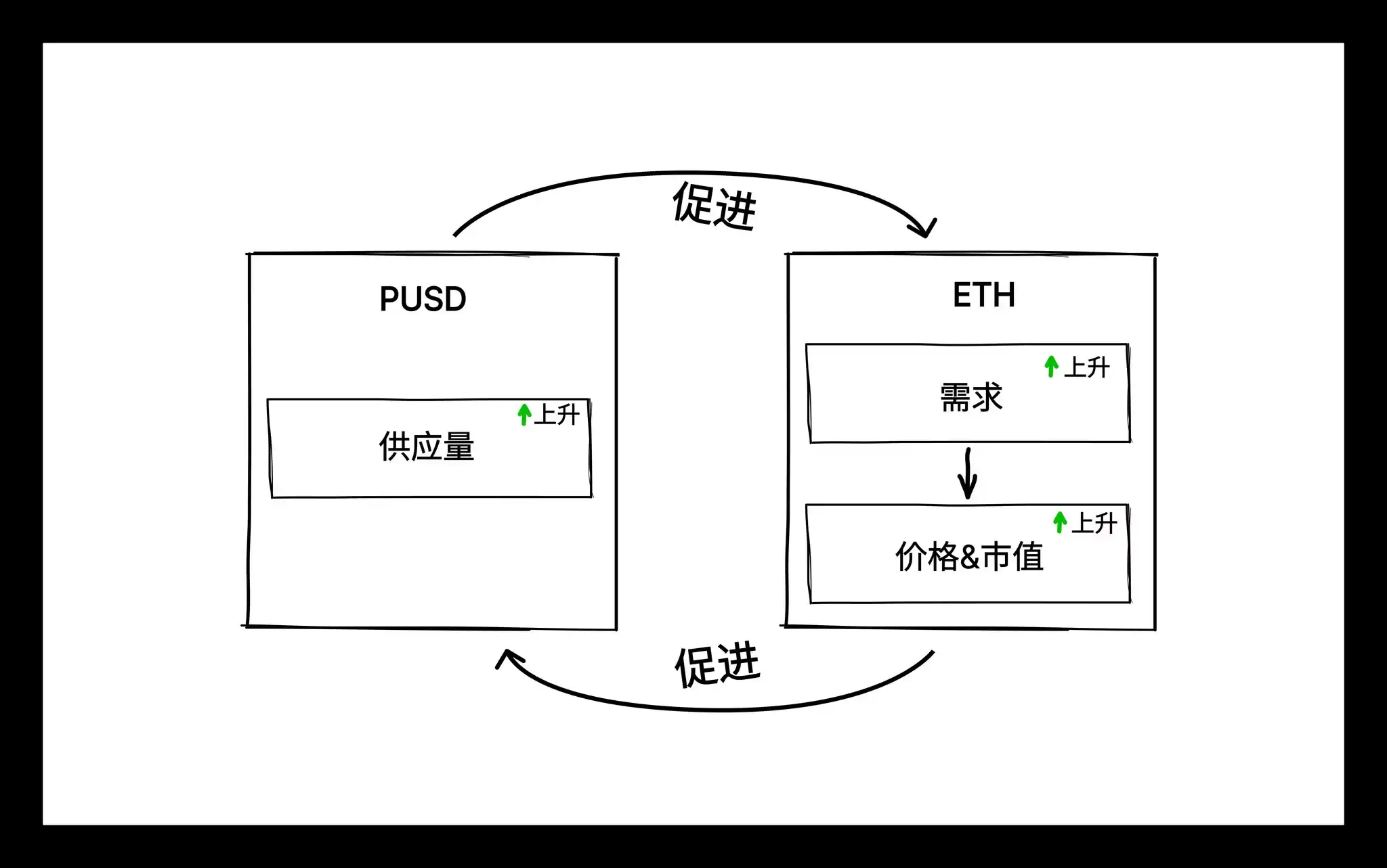 此外,由于 PUSD 的发行以等值的 ETH 为后盾,因此 PUSD 的供应量越大,对 ETH 的需求就越大。这反过来又会推高 ETH 的价格和市值。随着 ETH 市值的增加,发行更多 PUSD 的可能性也会增加,从而形成两种资产相互强化的正反馈循环。