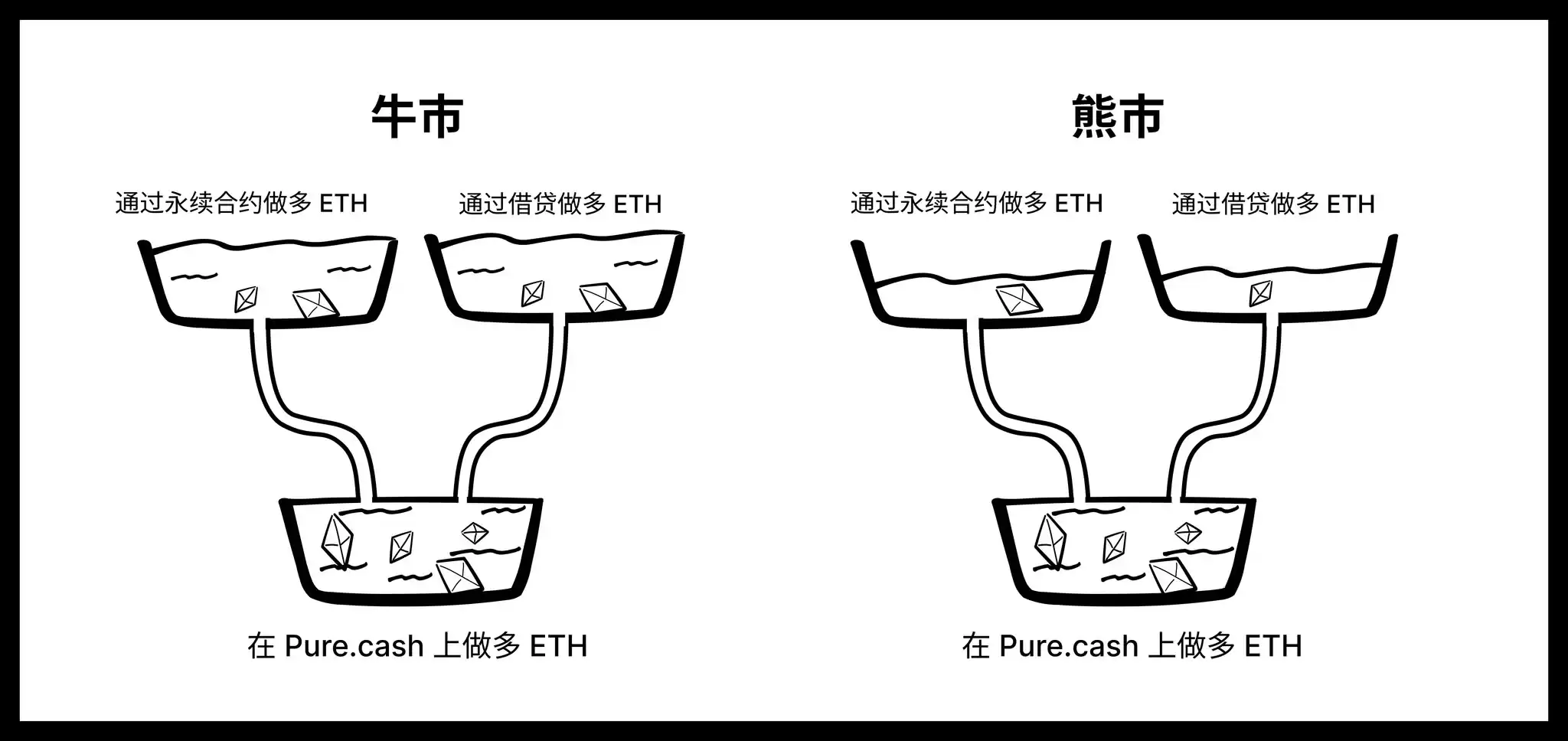 要创造持续的超额需求,不仅需要提供极具竞争力的产品,还需要确保需求始终超过供应。Pure.cash 内置的 LongOnly 永续合约允许用户以零成本持有 ETH 多头仓位,无需支付融资费用,仅收取 0.07% 的市场平均水平的交易费。让我们在两种情况下探讨一下当这种产品被广泛采用时可能出现的结果。