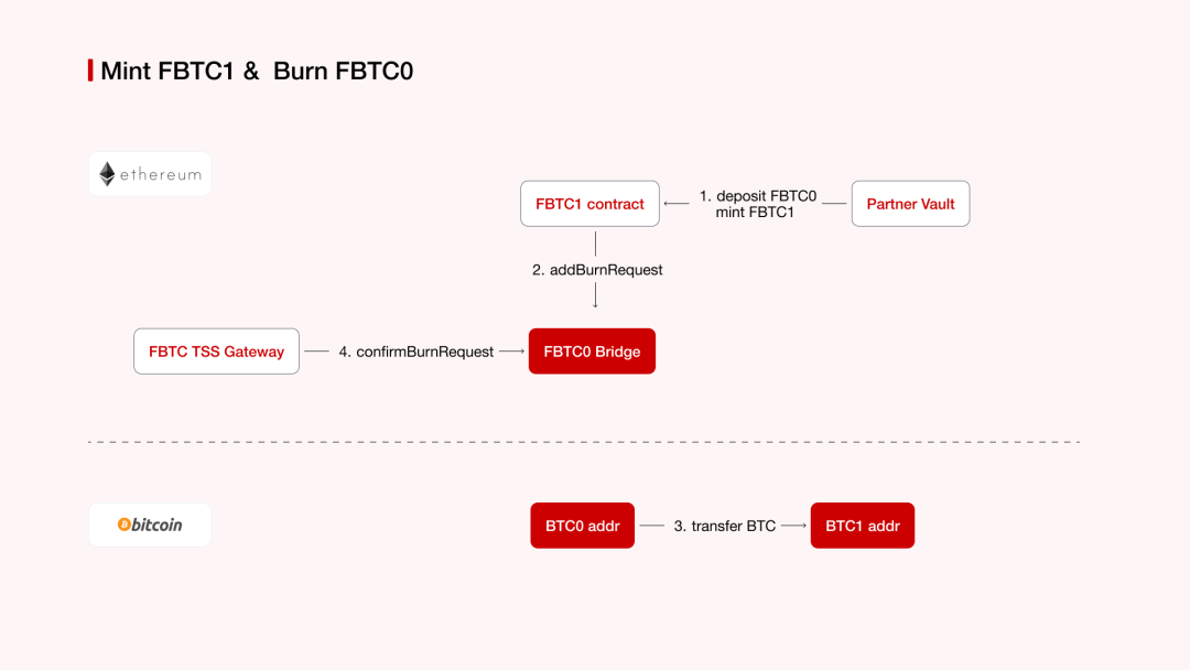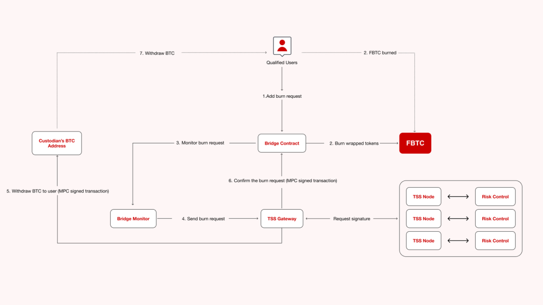 桥合约会首先燃烧源链上的 FBTC,随后,新链上 FBTC 的铸造流程与之前描述的类似:桥监控器实时捕捉到跨链请求后将其发送到 TSS 网关,多个 TSS 节点共同签名后,系统在新链上铸造等量的 FBTC,从而完成跨链操作。