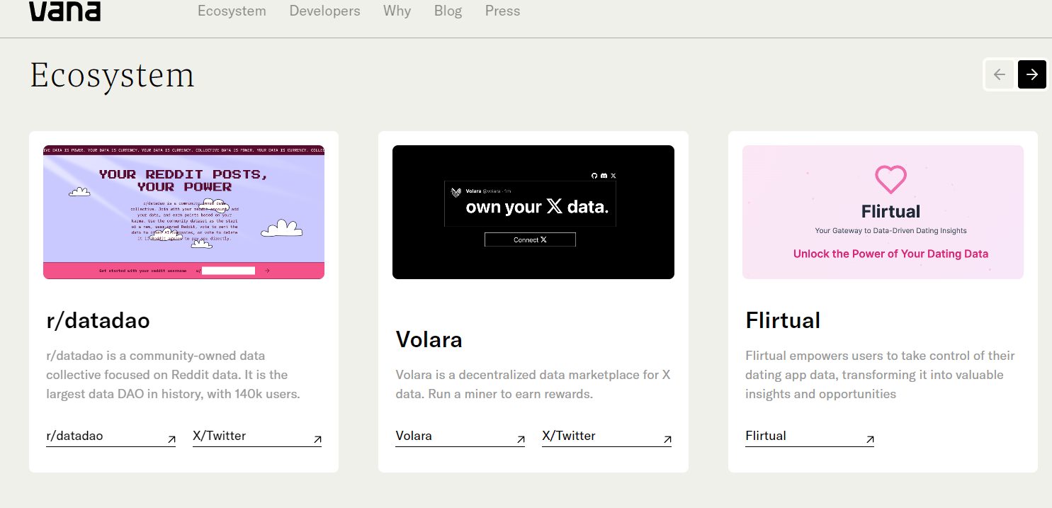 目前 Vana 的官网上列出了16个不同的数据 DAO,允许用户贡献如 Reddit、推特和约会软件等各类不同的数据,并通过 Vana 的区块链网络掌控自己对这些数据的控制权。