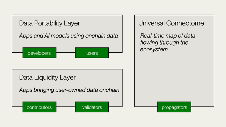 根据最新的架构图,Vana网络主要由三个关键组件构成:数据可移植层(Data Portability Layer)、数据流动性层(Data Liquidity Layer)和通用连接组(Universal Connectome)。