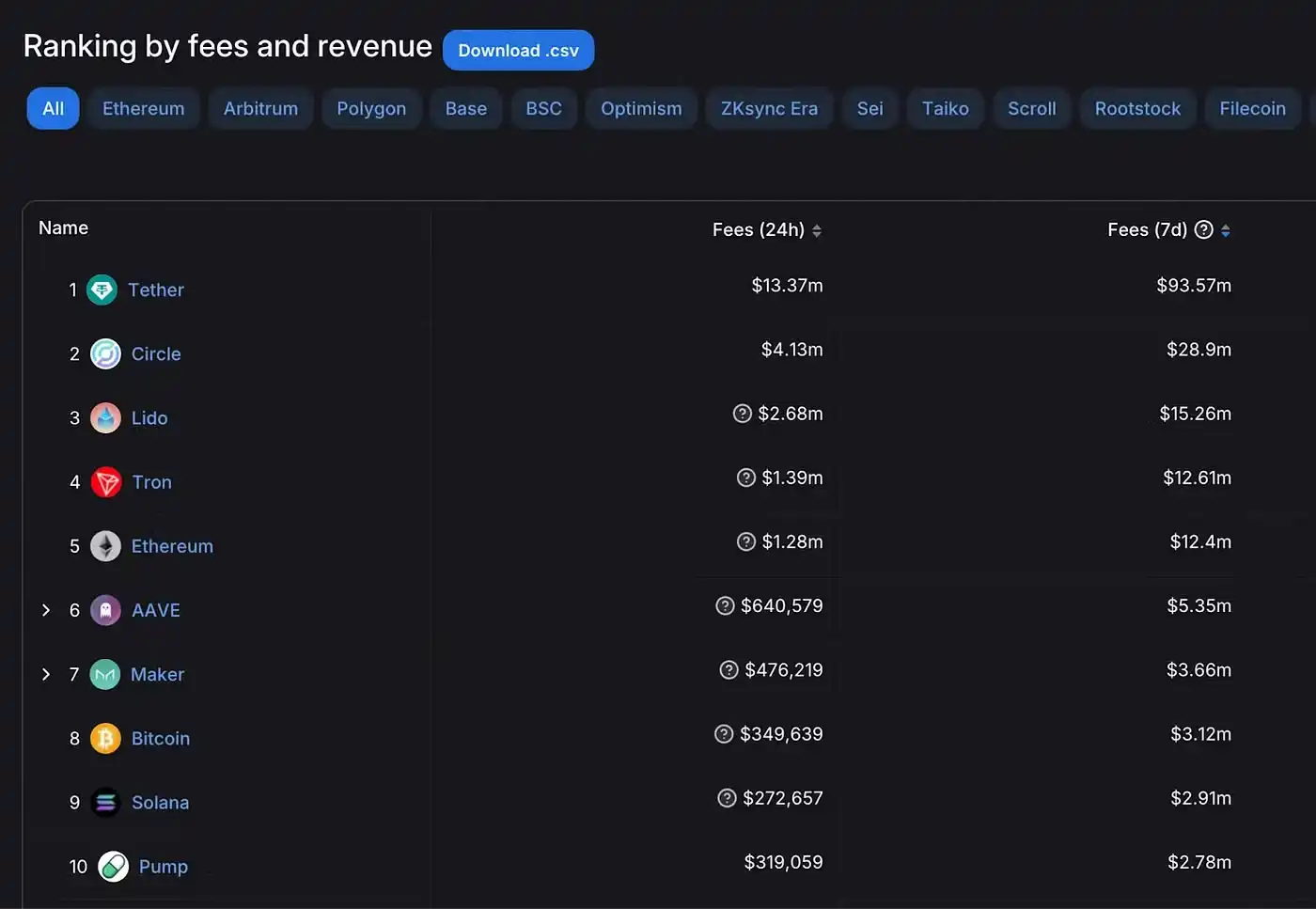 DefiLlama 7 天费用排名,2024 年 9 月 8 日