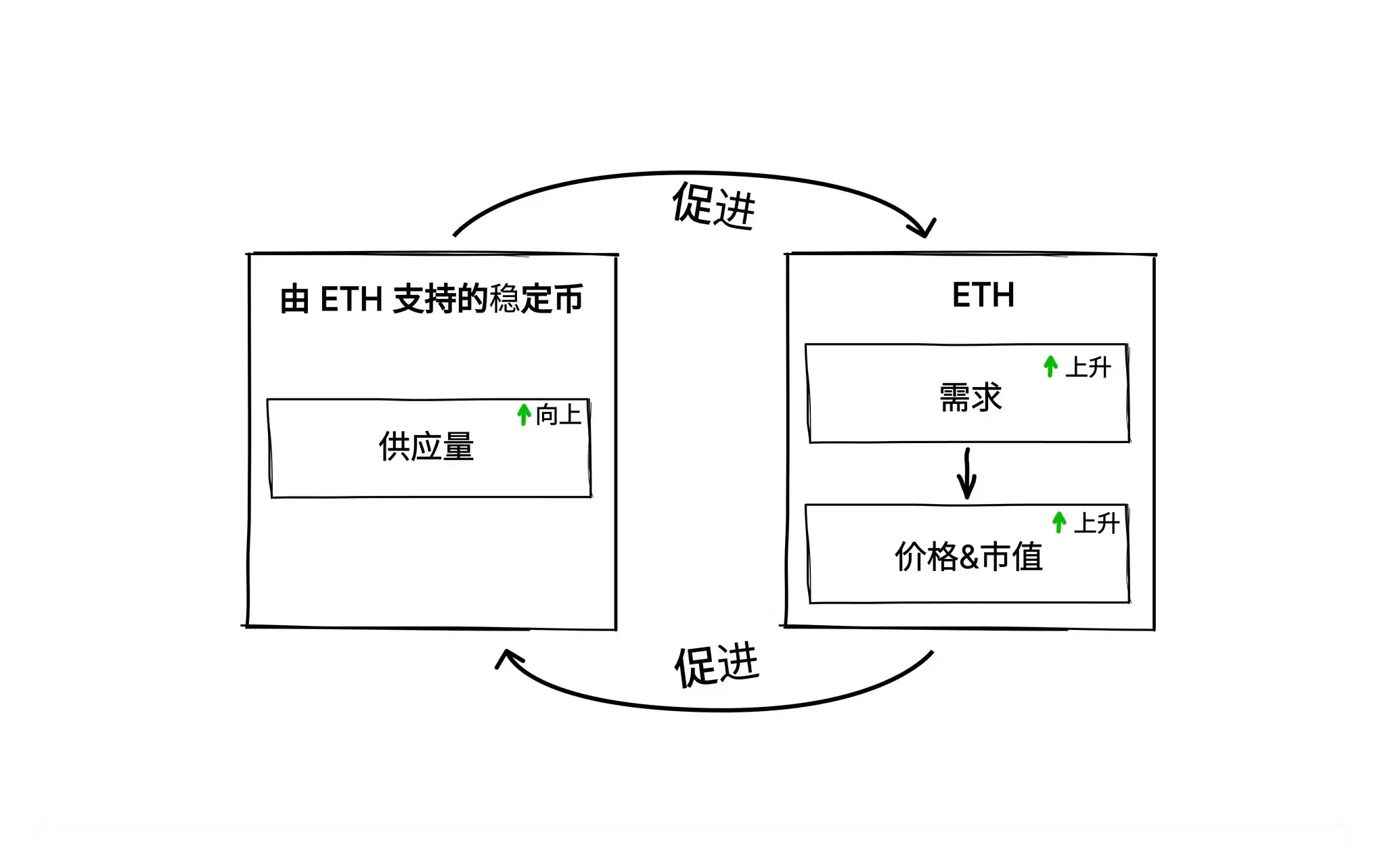 与中心化稳定币相比,抵押 ETH 发行的去中心化稳定币为 ETH 注入了直接动力,形成了一个正反馈循环:发行的稳定币越多,对 ETH 的需求就越高,这反过来又推高了 ETH 的价格和市值。随着 ETH 市值的增加,稳定币供应的潜力也随之增加。这有效地将一部分 ETH 转化为稳定币,并将价值保留在 ETH 本身内。