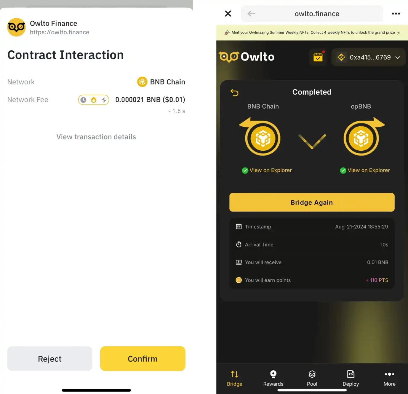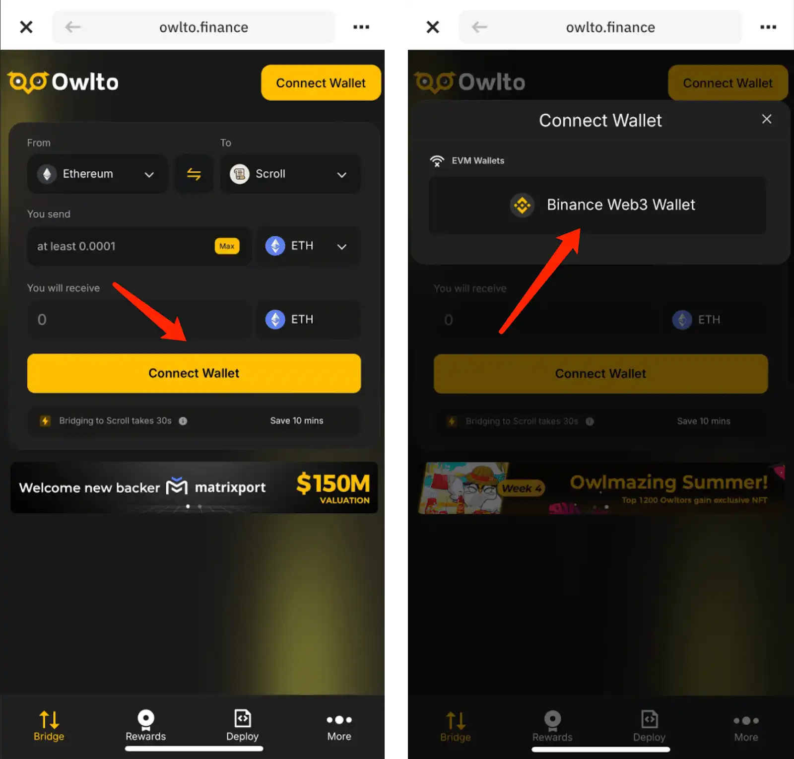请使用 Binance Web3 钱包的 MPC 地址连接到 Owlto Finance。并且桥接以下三种资产:ETH、BNB 或 USDC。在一次交易中桥接中,至少交易 0.0015 ETH、0.01 BNB 或 5 USDC。难以相信,现在还有如此低成本高回报的活动。