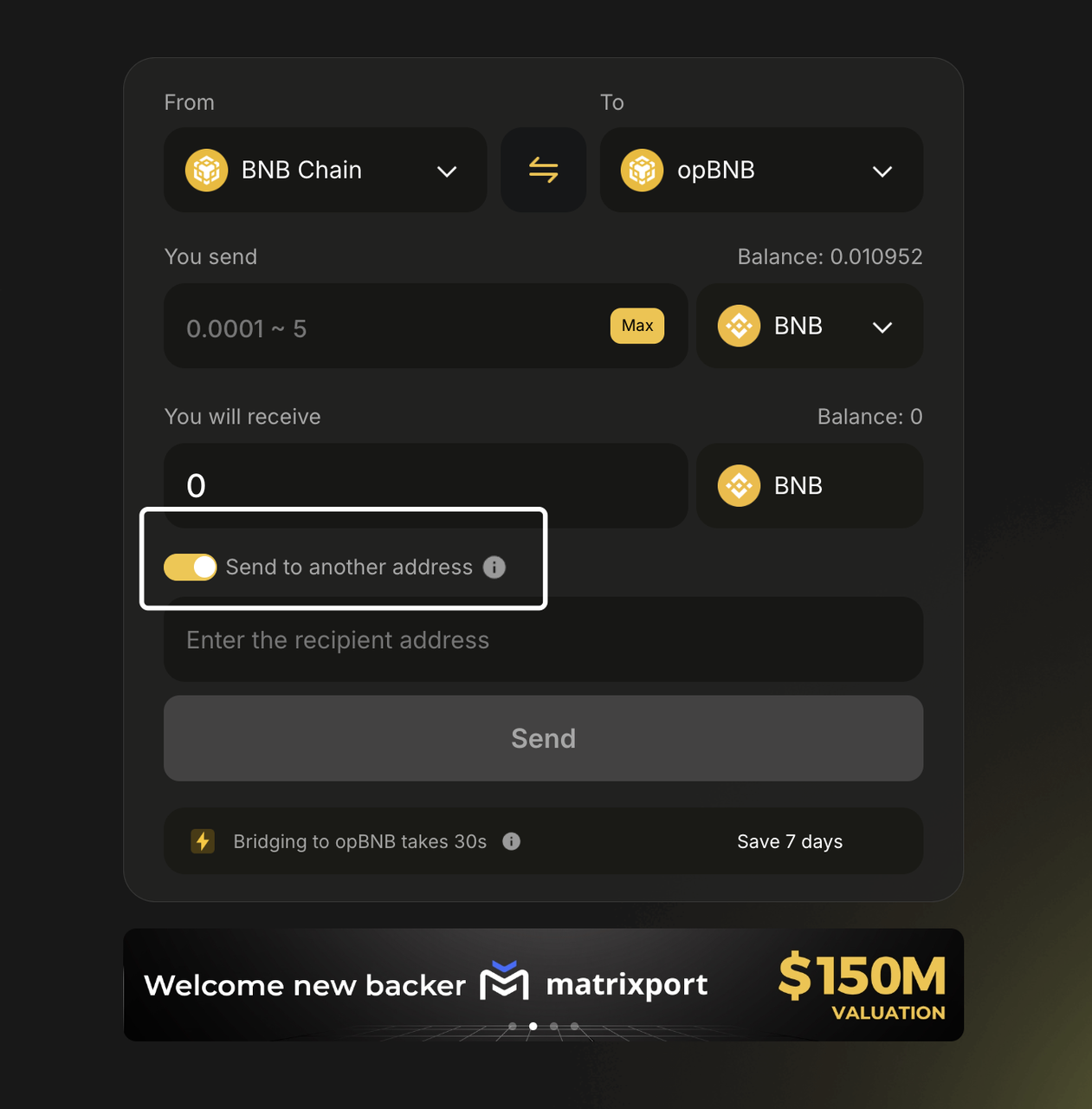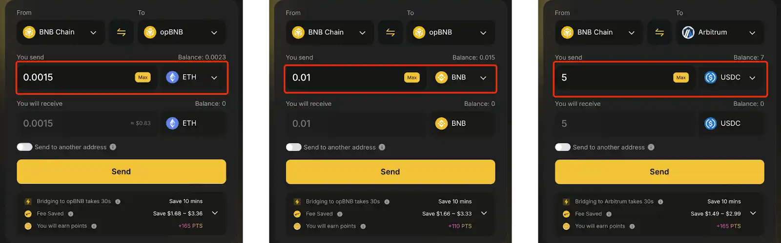 3. 选择你想要桥接的「From」网络和「To」网络。选择 ETH/BNB/USDC 代币,输入至少 0.0015 ETH / 0.01 BNB / 5 USDC,然后点击 [发送]。请确保你的钱包中至少有 0.00215 ETH、0.015 BNB 或 7 USDC,以便覆盖额外的 Gas 费用。