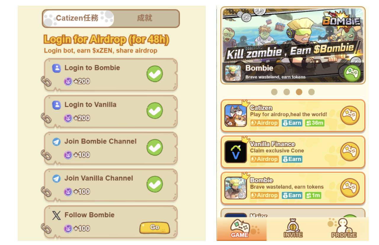 前文提到,Miniapp Center 选择 Catizen 游戏内置窗口的进入模式。同样,Catizen 在生态内的引流模式上也运用了「内置引流」:以 Catizen 任务+空投奖励的形式直接从 Catizen 游戏内为其他应用引流,另外 Miniapp Center 的置顶功能本身就具有引流功能。