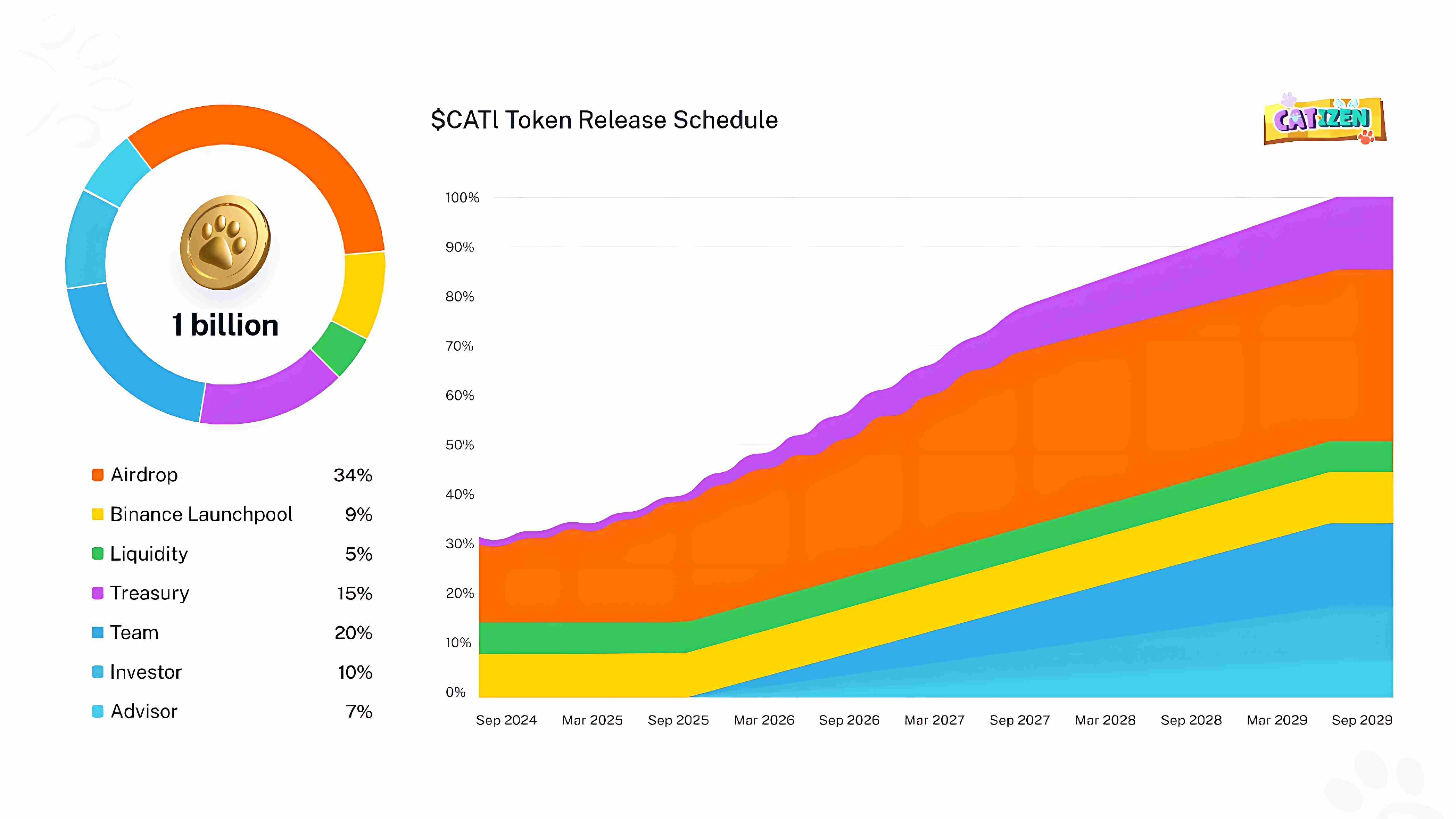 $CATI 将作为 Catizen 生态系统、Miniapp Center、Launchpool 和 Open Task 的通用货币,用户可以使用 $CATI 在整个生态系统中无缝交互,从游戏内购买到参与新项目启动,生态中时刻存在对 $CATI 的需求。