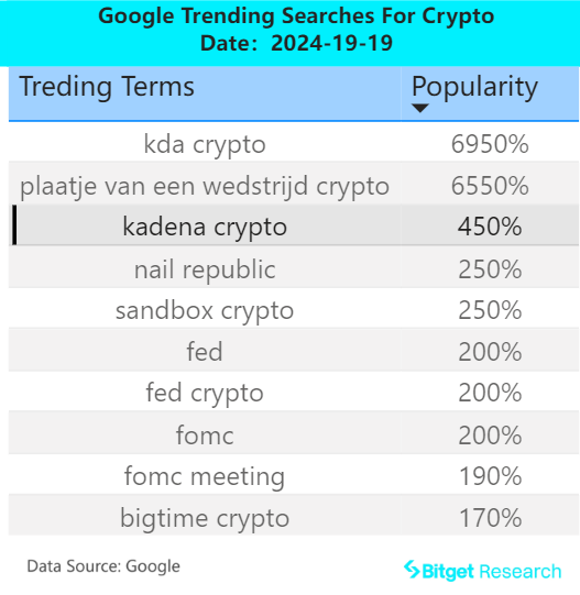 (2)欧美地区的热搜分散,主要关注近期涨势非常好的项目,其中包括:KDA、HNT、NEIRO、FLOKI 等项目;另外该区域项目对议息会议比较关注,FOMC、FED 等关键字登上热搜。