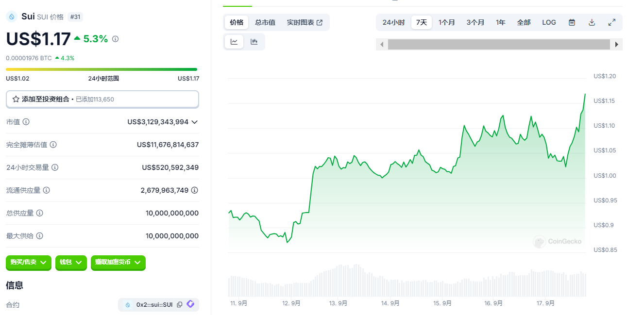 根据 CoinGecko 数据,SUI 代币 1.17 美元,过去 24 小时交易量达 5 亿美元,23 小时涨幅达 2.3%,过去 7 天涨幅高达 28%,在市值 Top30 中代币涨幅排名第一。相关阅读:《SUI 领涨加密市场:DeFi 生态爆发、灰度信托加持,价格还能飙升几倍?》