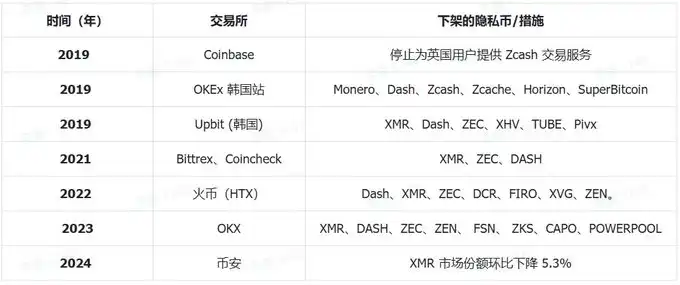 交易所下架隐私币情况: