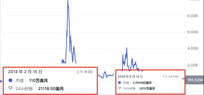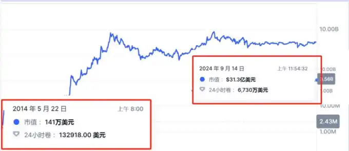 2014 年上市,经过近十年的发展,从初期上市时约 141 万美金市值,当前 FDV31 亿美金,涨幅约 2200 倍,已然为该赛道的龙头项目。