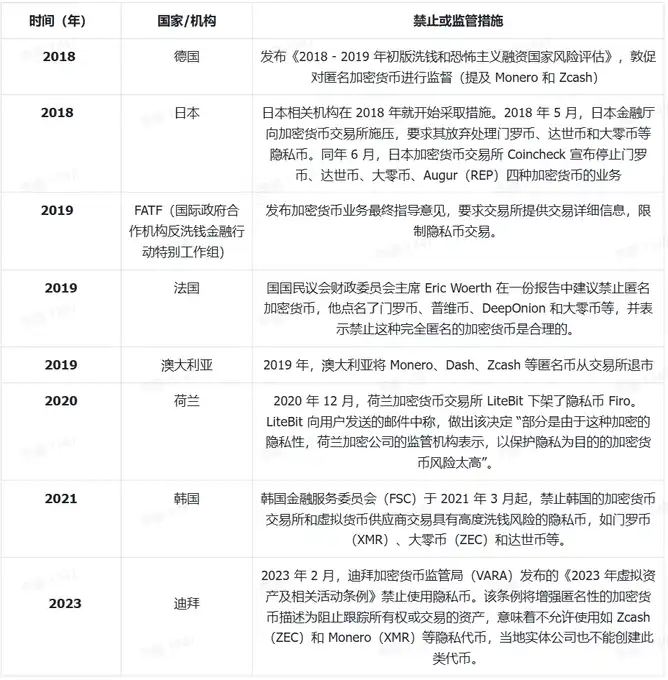国家禁止隐私币情况: