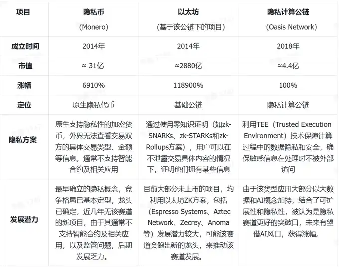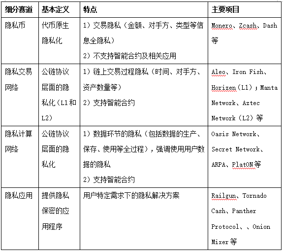 隐私赛道大致可分为隐私币、隐私交易网络、隐私计算网络、隐私应用这四大板块,细分赛道主要特点如下表: