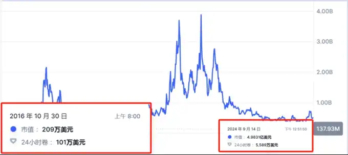 其代币于 2016 年 10 月发行,市值从早期的 209 万美金增长到如今约 5 亿美金,涨幅约达 240 倍,但较其巅峰已跌去 90%。