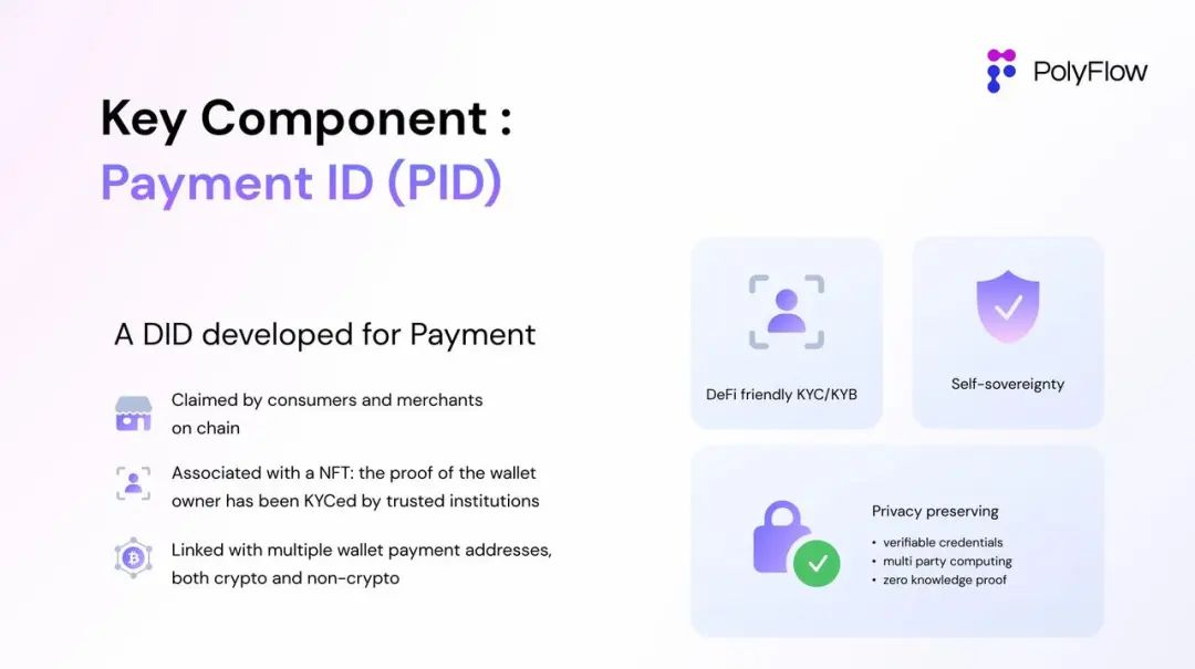 PolyFlow 推出的 Payment ID(PID)是一个去中心化的 ID,是交易信息流拆分出来的产物,能够与加密后用户隐私保护的 KYC/KYB 证明信息绑定,关联用户在多种平台上的可验证凭证(Verifiable Credentials),能够实现: