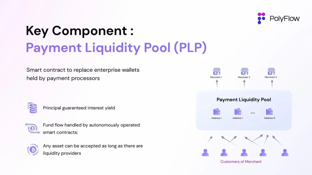 PolyFlow 推出的 Payment Liquidity Pool(PLP)是资金流拆分出来的产物,智能合约地址用于接收交易的资金,实现资金的链上托管,而非依赖于中心化机构昂贵企业钱包的传统方式。