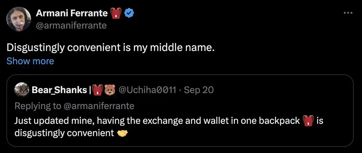 Ruby:Backpack 是从 web3 钱包开始,现在增加了交易所的体验到钱包里。而多数中心化交易所如 Binance、OKX、Bybit 等也都在 CEX App 里增加 web3 钱包,最终大家都想打造 Super App,你们如何提供独特的服务和产品体验?怎么看待这种比较?
