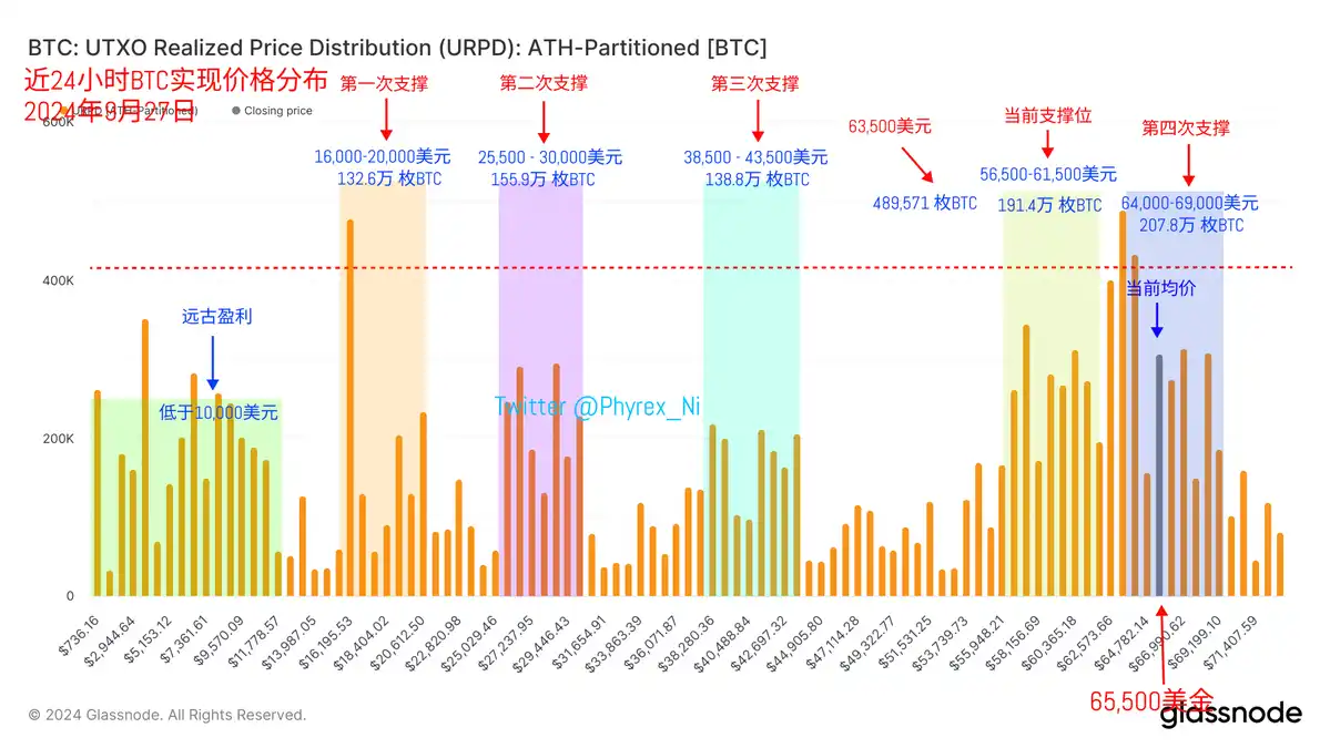 而较早期持仓的投资者仍然是无动于衷,62,500 美元到 64,000 美元之间的筹码密集区仍然在增加,目前已经超过了 132.4 万枚,而 64,000 美元到 69,000 美元的支撑仍然保持很良好的状态,目前价格的变化仍然要看短期持有者是不是愿意释放手中的筹码。