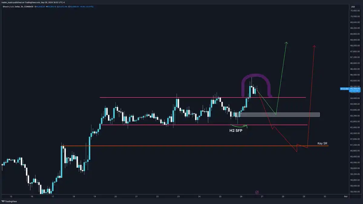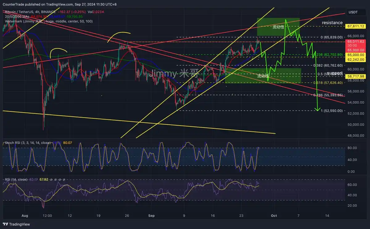 7 月 29 日 BTC 突破 70,000 美元 后,开启了一轮下跌趋势,在 8 月 5 日到达 49,000 美元又反弹至 65,000 美元 继续下跌在 9 月 6 日在 53,000 美元附近形成了类双底结构后,9 月 19 日美联储确定降息,BTC 顺势上涨。9 月 26 日美盘时段,伴随着美股指数的强势上涨,BTC 已经突破前一轮高点 65,000 美元,破坏了更低的低点和更高的高点的结构。