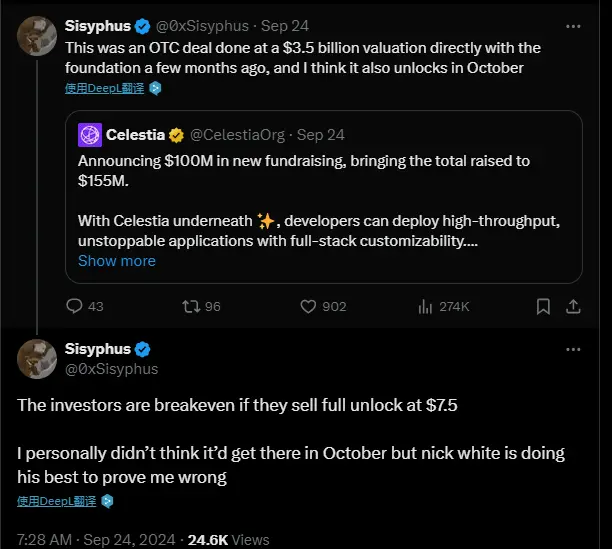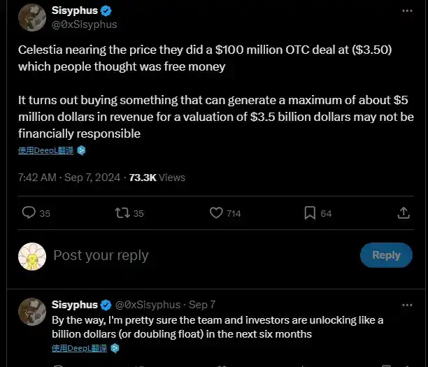其实,早在 9 月 7 日,Sisyphus 就在自己的社交媒体发文提醒,Celestia 完成了 1 亿美元的场外交易,币价大约在 3.5 美元。团队和投资者将在未来半年内解锁十亿美元的资金。