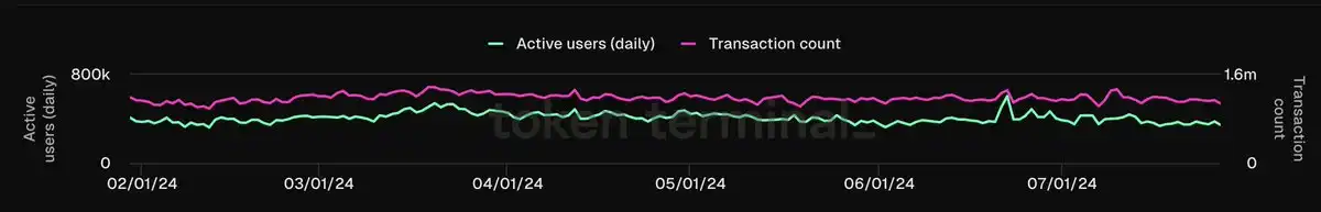 以下是 ETH 主网与 SOL 的用户基数对比(仅比较主网数据,因为在 Dencun 升级后,ETH 大部分手续费来源于主网,数据来源:@tokenterminal):
