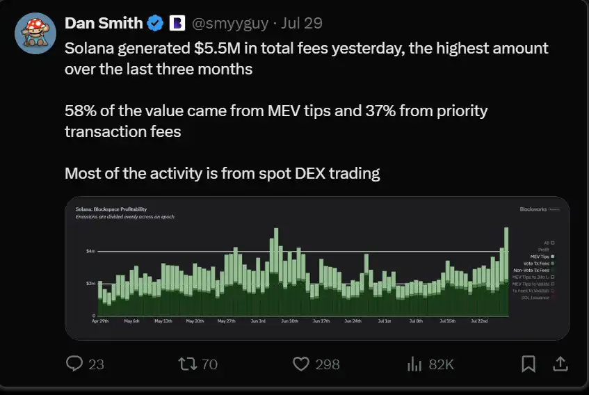 成熟的参与者被激励去建设最佳的基础设施,以利用这一局面。在我的深入研究中,有几个来源提到这些参与者投资控制交易池空间,并随后向第三方出售访问权限的传言。然而,我无法验证这些信息。不过,确实存在一些明显的扭曲激励机制——通过尽可能多地将山寨币活动引流到 SOL,这使得某些成熟的个体能够继续从 MEV 中获利,以及在这些山寨币上进行内幕交易,并从 SOL 的价格上涨中受益。