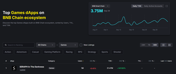 从 7 月 12 日至 8 月 16 日举行的 Rush 系列活动也助推了 Seraph 的增长。活动期间,Seraph 成功吸引了超过 70 万 Feather NFT 持有者,这些 NFT 是未来兑换 Seraph 代币的链上凭证。该活动促成了超过 1,700 万次链上转账,帮助 Seraph 登顶 BNB Chain 的 GameFi 排行榜。这些数据展现了 Seraph 在 BNB Chain 生态系统中的主导地位。