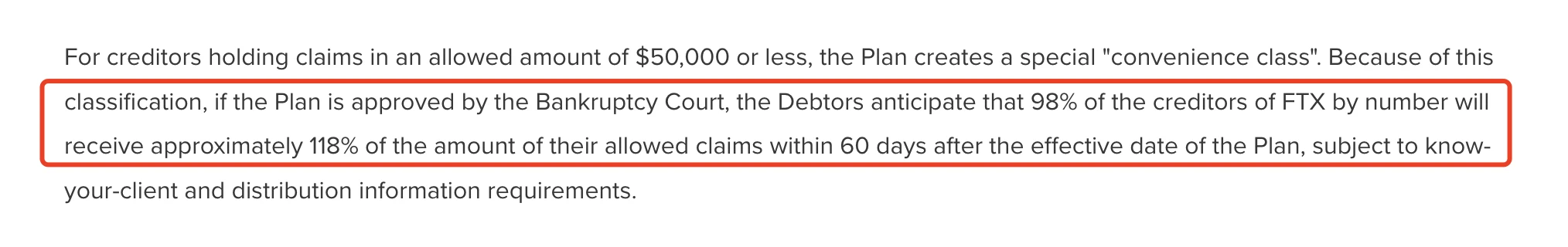 随着该计划的正式获批,接下来 FTX 将在该破产计划生效后的 60 天内对 98% 的用户进行赔付。