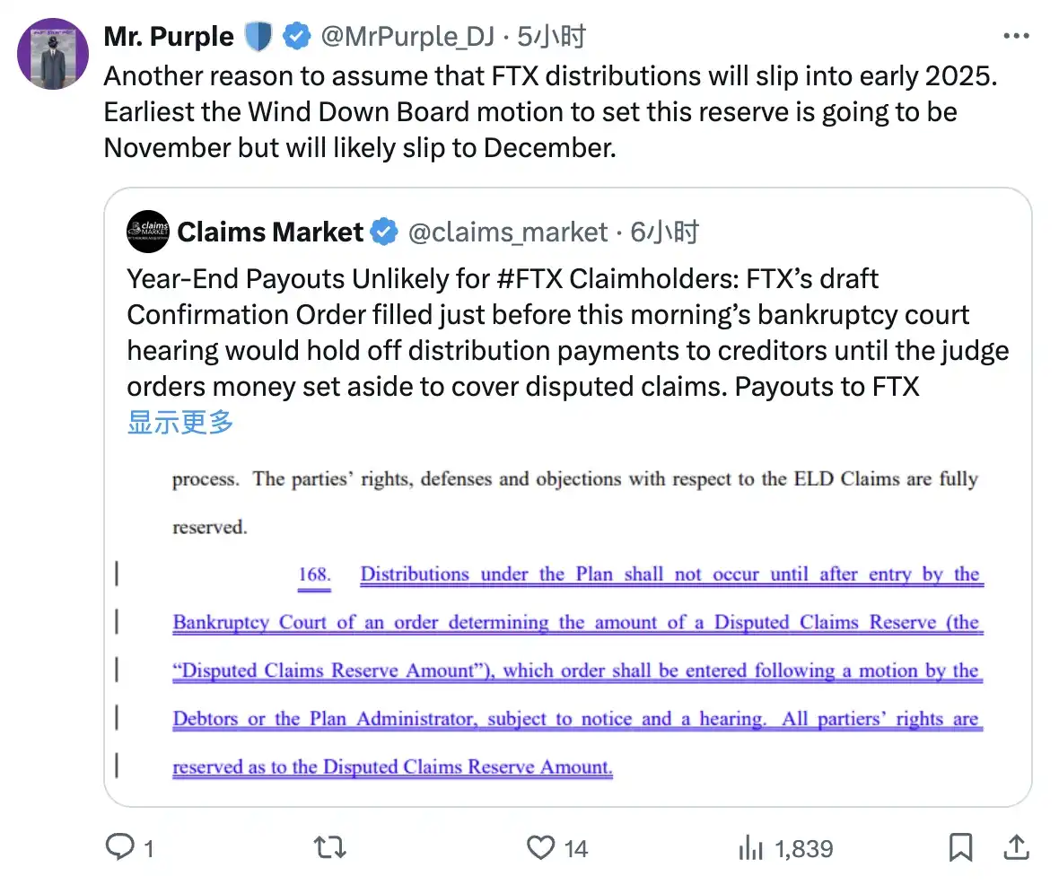 不过,Mr. Purple 还援引了债权交易市场 Claims Market 的另一种说法,认为赔付可能会延期至 2025 年初,因为设定赔付储备金的 Wind Down Board 动议最早将在 11 月提出,但也有可能会推迟到 12 月。