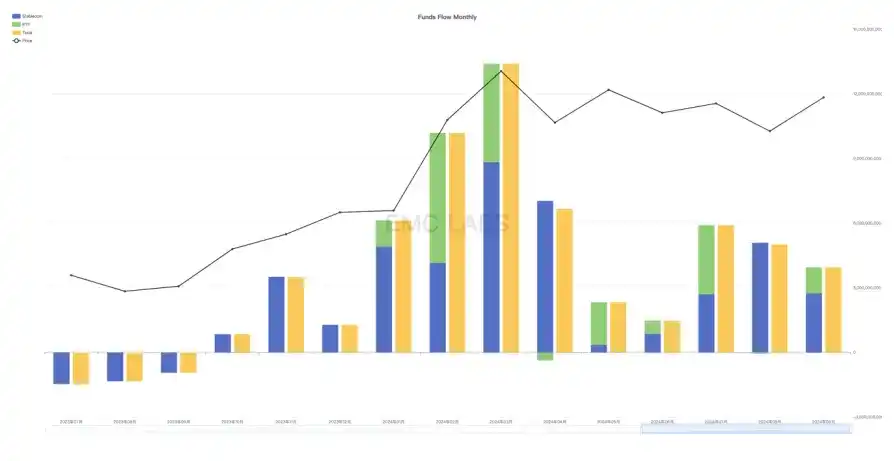 稳定币及美国 11 支 BTC ETF 月度资金流动统计