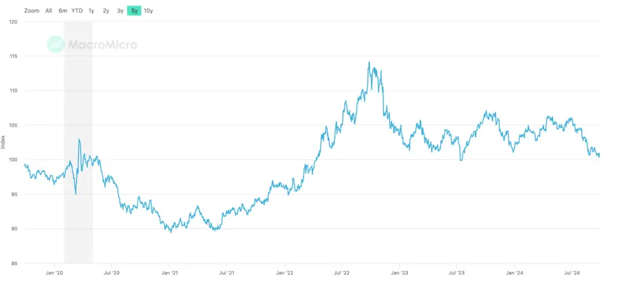 降息启动,美元指数略有反弹之后重回跌势,及至月底再次逼近 100 关口,回到 2022 年 4 月的点数。随着降息持续进行,跌破 100 或只是时间问题。