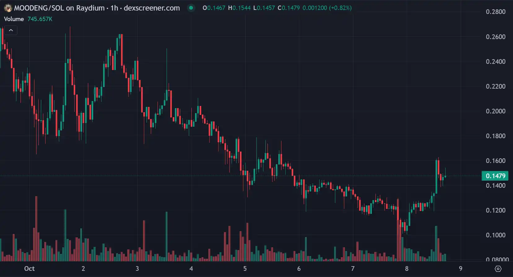 国庆假期期间,以太坊联合创始人 Vitalik Buterin 通过 KyberSwap 卖出 117.6 亿枚 MOODENG 兑换为 21.033 枚 ETH(约 5.09 万美元)。10 月 7 日,Vitalik 地址再次出售 100 亿枚 MOODENG 获得 308.69 枚 ETH (76.2 万美元) 并将 260.16 枚 ETH (64.2 万美元) 转给慈善机构 Kanro,这让以太坊上的 MOODENG 市值大力拉升创下新高。
