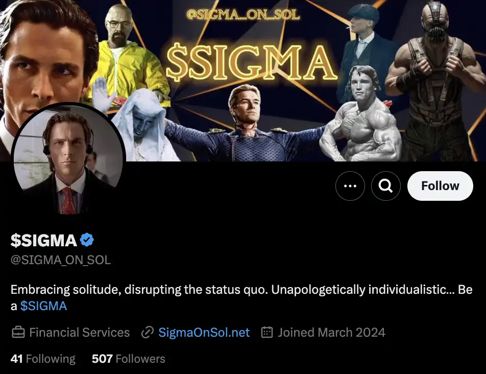 SIGMA 的概念和 GIGA 有些类似,都是一种男子气概的描述,「Sigma Male」一词最初由美国另类右翼作家 Vox Day 在 2010 年的一篇博客文章中首次创造,它描述了一种成功且受欢迎但更喜欢在传统社会等级制度之外运作的男性原型,通常被描述为寻求自我控制而不是社会统治的「独狼」。