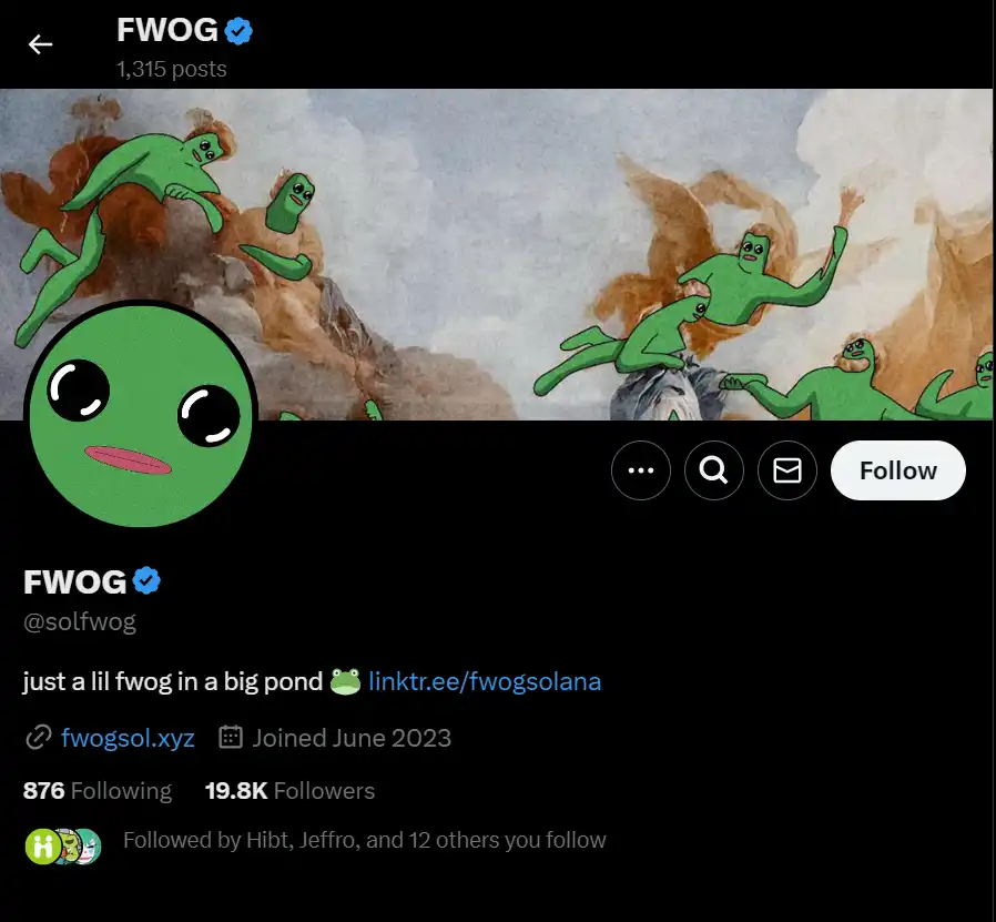 作为这一轮资本布局下的 Meme 狂潮新秀王者,PePe 正在崛起,而以经典青蛙形象为核心的以太坊 OG 项目 $FWOG 则是这一领域的元老,青蛙元素在 Meme 文化中成为绝对的主角。
