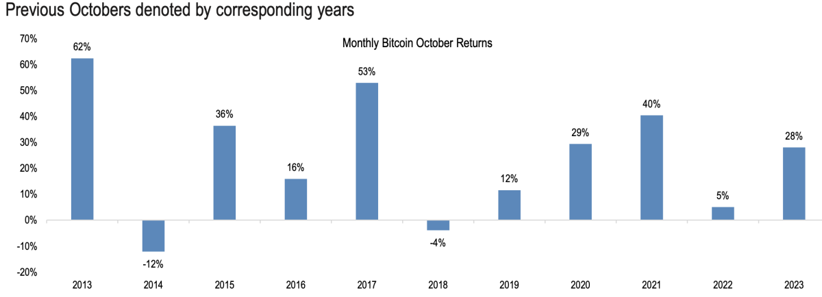 「虽然之前的表现并不能预测未来的表现,但我们认为『Uptober』的流行可能会影响行为,并导致比特币在十月表现良好,」分析师写道。