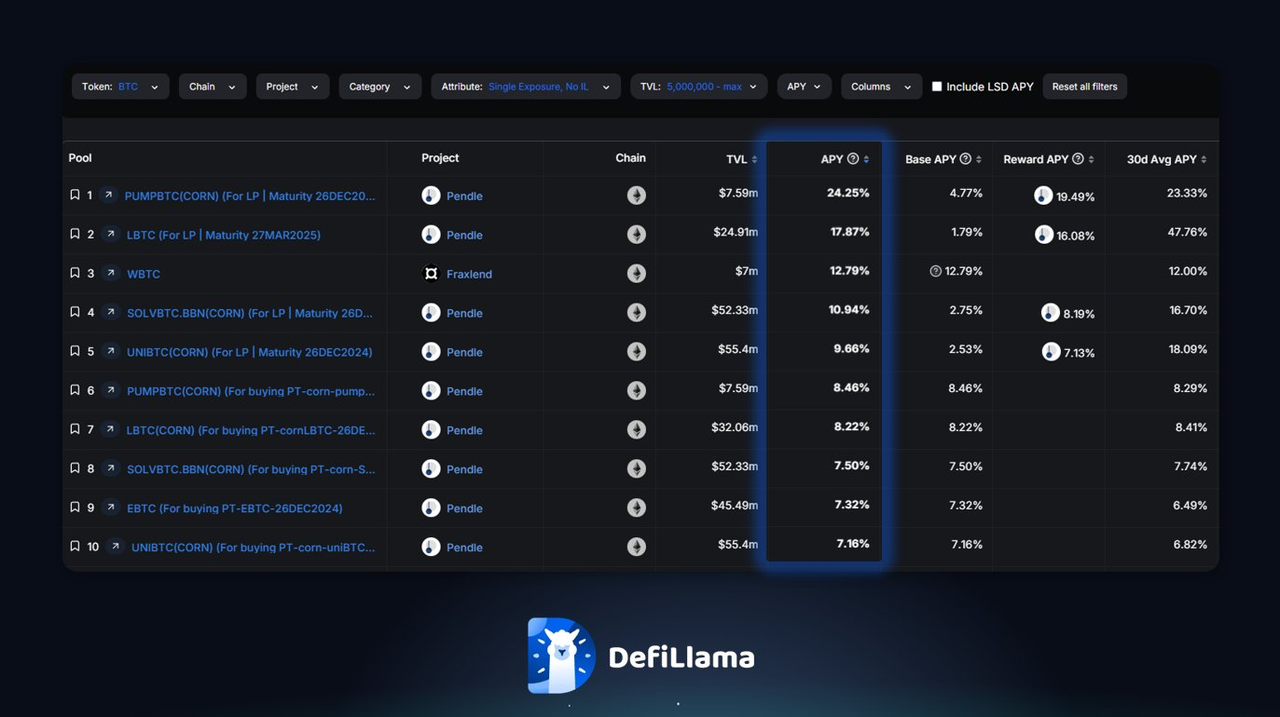DeFiLlama 数据显示 BTC 最高年化收益平台