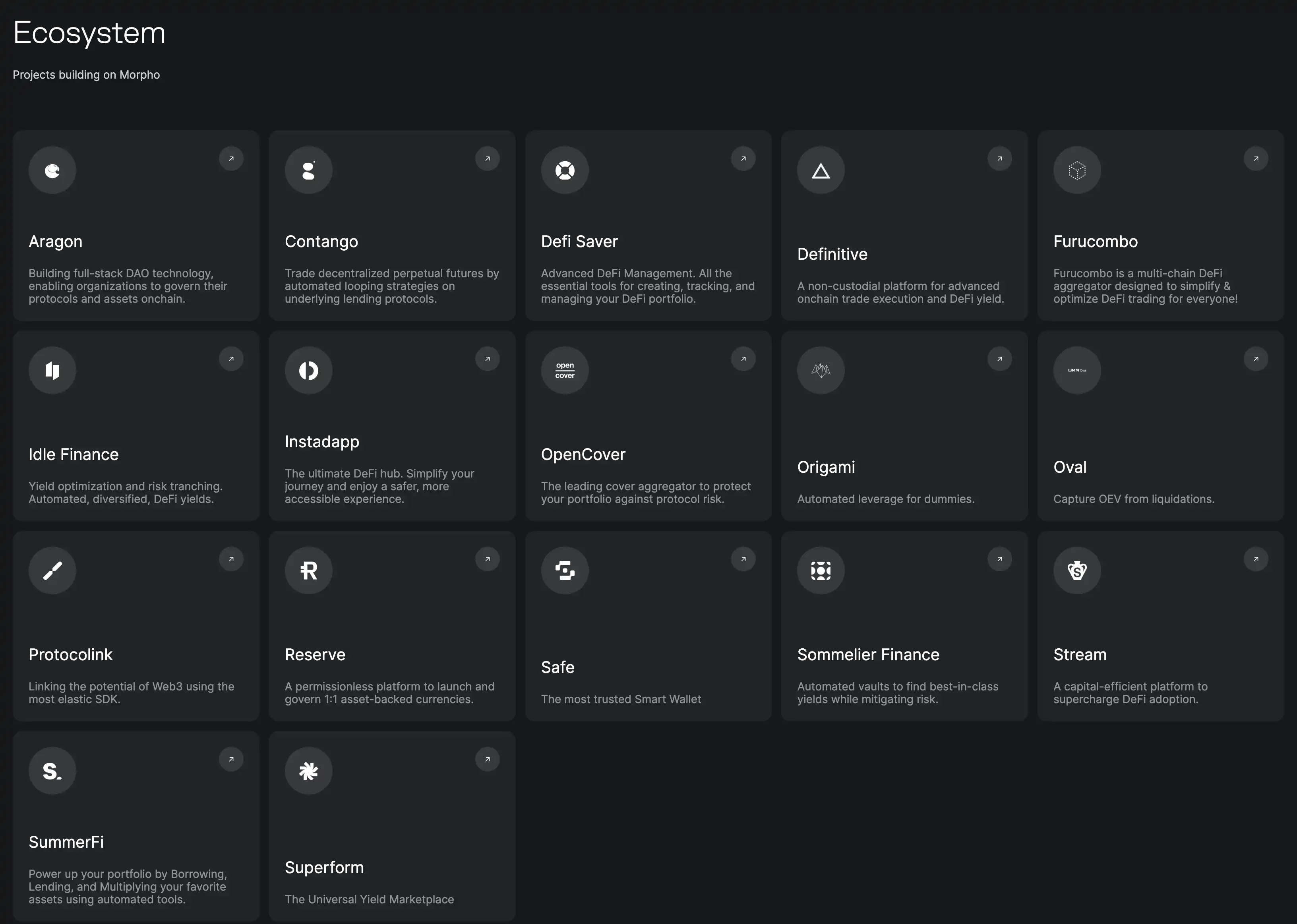 除了上文提及到的与 Morpho 有联系的、MakerDAo、Ethena 和 Usual 等重要 DeFi 协议,Morpho 还集成了 Safe、Defi Saver、Furucombo、Superform 和 Instadapp 等 DeFi 赛道中久经考验的各种工具和协议。要知道 Morpho 的存款额在最高峰时超过了 30 亿美元,其中被借出的大量资产都通过专业的策划者的资产分配,都流向了我们熟知的各种 DeFi 协议之中。