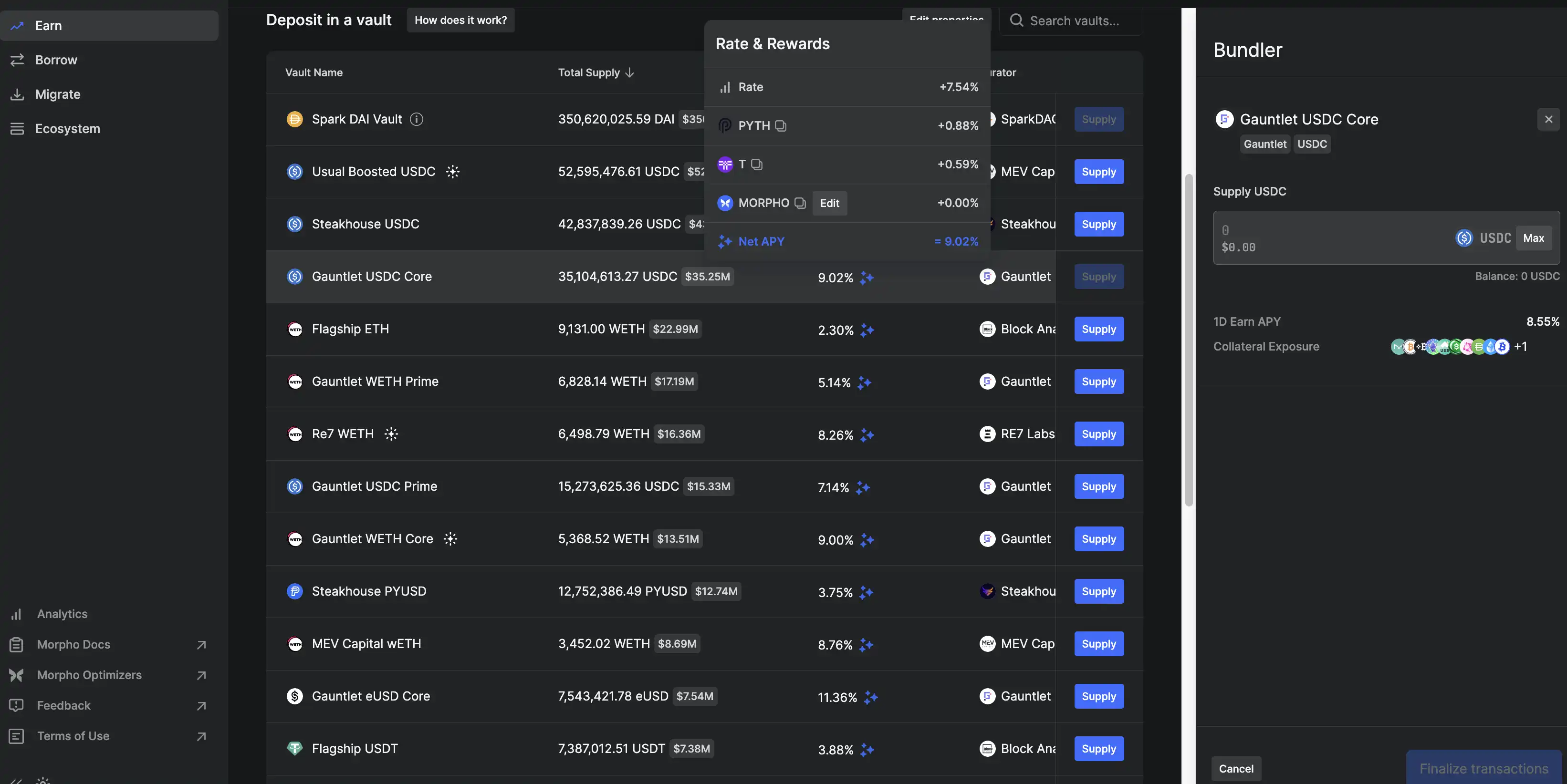 对于存款用户来说,在 Eran 页面通过搜索功能可以直接筛选出你需要的资产,存入资产后,不仅可以赚取借款人支付的基础收益,还可以获得 MORPHO 代币和由第三方提供的其他奖励。利息在从金库提现时发放,奖励则每月在奖励页面发放并可领取。