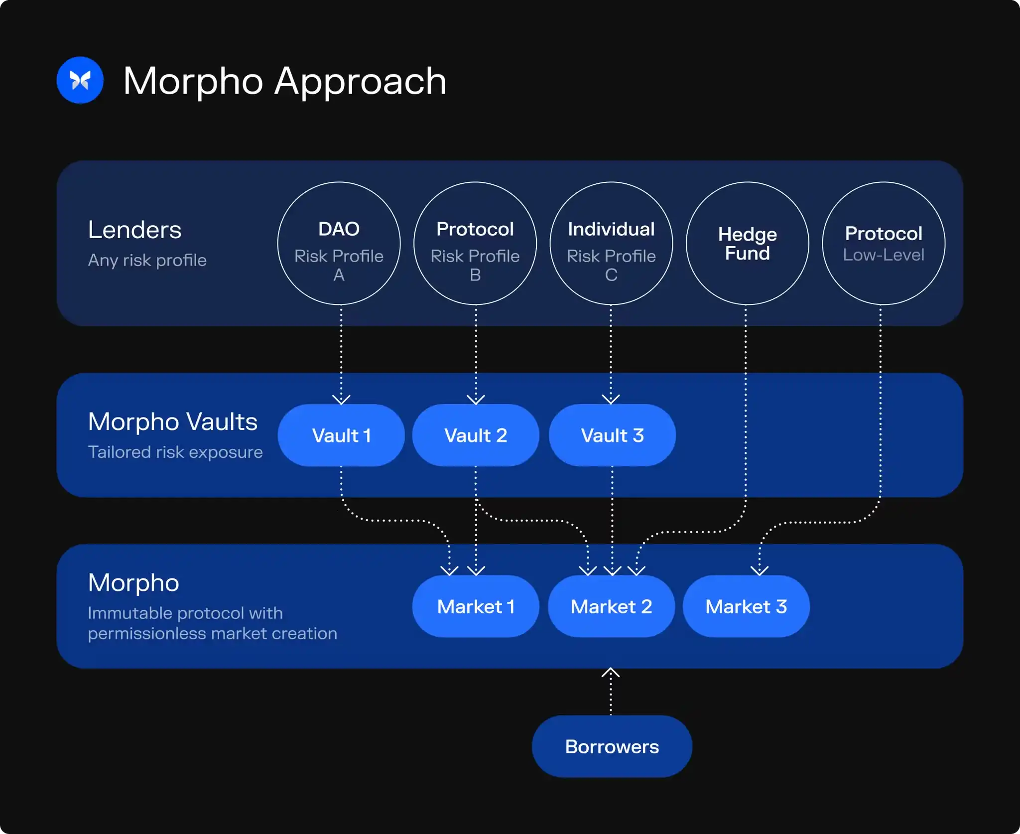 伴随着 DeFi Summer 而产生的 Morpho,在协议初始阶段中将自己的定位于提升已有 DeFi 协议的资金效率,「将 Compound 或 AAVE 使用的流动性池模型与订单簿中使用的点对点匹配引擎的资本效率相结合。通过提供相同的用户体验、流动性和清算参数来改进 Aave 或 Compound,但由于点对点匹配,APY 有所提高。」
