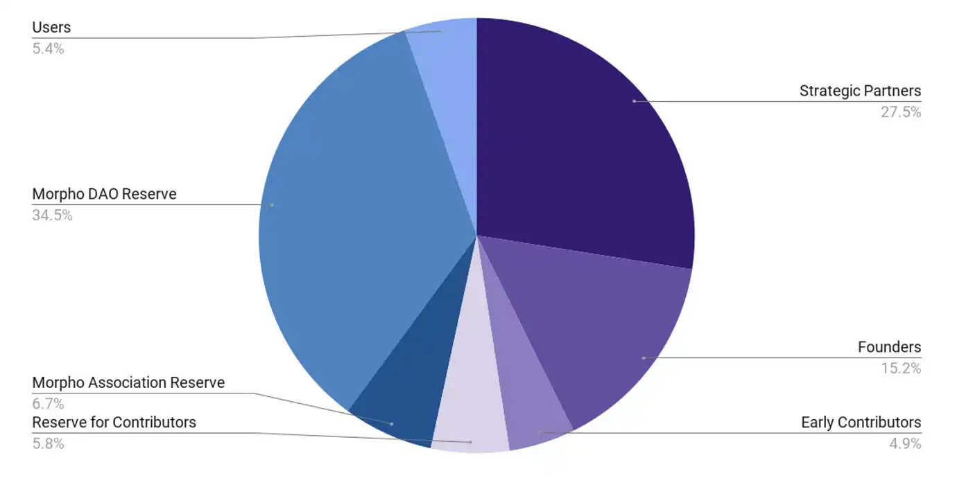 MORPHO 是 Morpho 协议的治理代币,代币的最大供应总量为 10 亿。截止到 9 月份,MORPHO 分配情况为:
